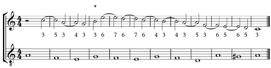 Le stelle nell'esercizio sopra contrassegnano il punti dove lo stile sincopato si rompe perchè sul tempo forte introduco una nota non legata. In questa realizzazione sono riuscito a inserire 6 dissonanze (contrassegnate con X), correttamente preparate e risolte, quindi proseguo. |